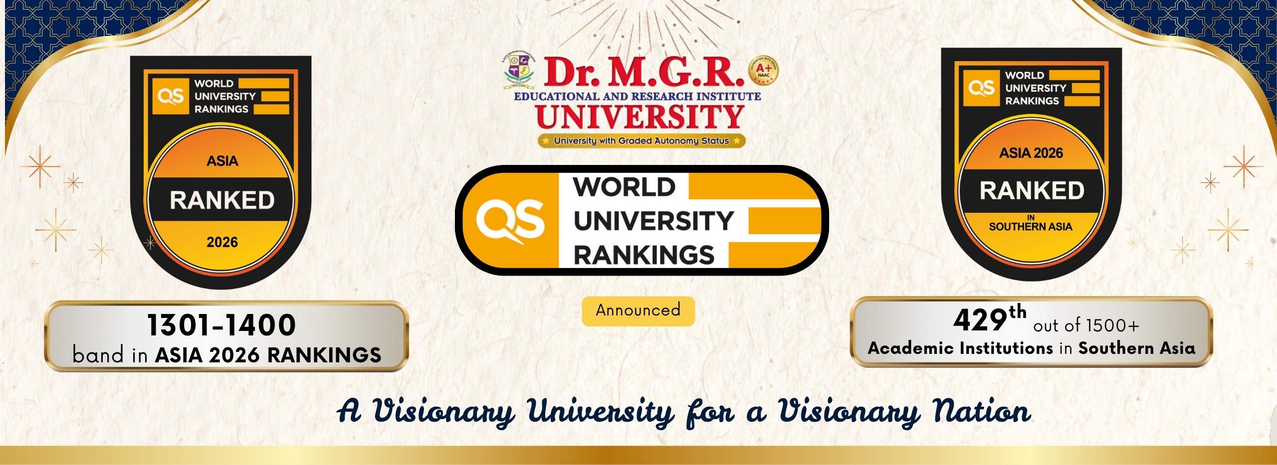 Dr. M.G.R. Educational and Research Institute, Deemed to be University has brought in to service of the public with necessary approval from 2003. The Ministry of Human Resources (MHRD), Govt. of India has graded Dr. M.G.R. Educational and Research Institute – Deemed too be University under Graded Autonomy Status in Category – II. The University is accredited by NAAC and accorded with “A+” Grade (3.48 out of 4) rating by the National Assessment and Accreditation Council (NAAC), an autonomous body under UGC.